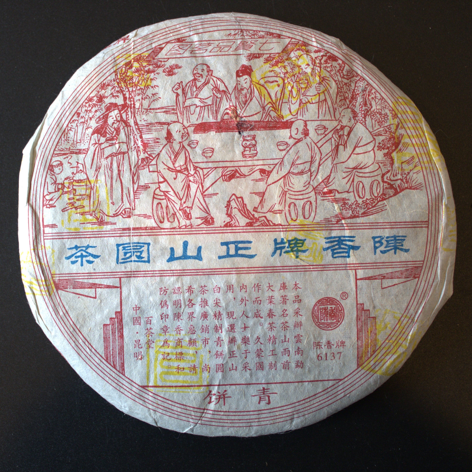 Bai Cha Tang (Hall of 100 Teas) is a small Kunming tea shop run by Mr. Ai-Tian who personally oversaw all of the production of his tea cakes. This 7th generation Mengku is a high-end cake form a large arbor tea series (per the seller).